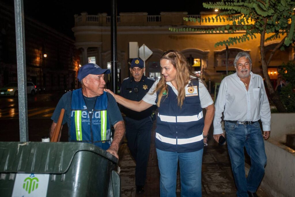 Mérida, Yucatán, viernes 26 de septiembre de 2025.- Para verificar el orden en el Centro Histórico de Mérida tras la lluvia y apagón que se registraron la tarde de este viernes, la presidenta municipal Cecilia Patrón Laviada realizó rondín y caminata acompañada de elementos de la Policía Municipal y personal de Servicios Públicos.